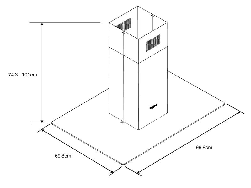 Campana decorativa, montaje tipo Isla 100 cm con exclusivo Filtro de Carbón Activado* y cielo de cristal templado plano. Cuenta con capacidad de extracción hasta 617 m³/hr, 3 velocidades + Turbo/Boost, 2 luces de trabajo LED y sensor de prendido y apagado automático.