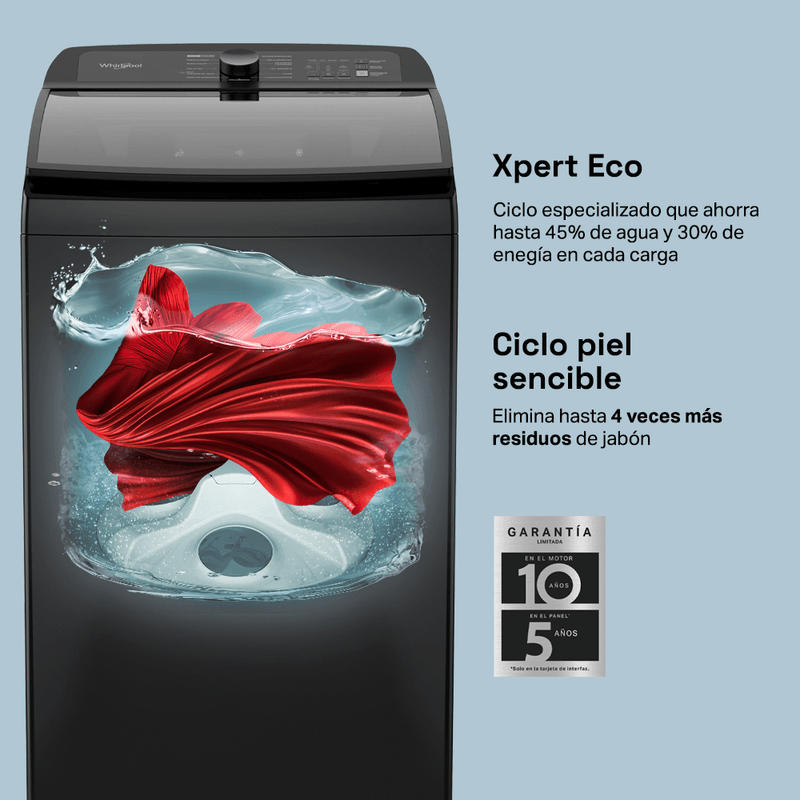 Lavado inteligente que ahorra mientras cuida tu ropa. Ahorra en promedio 125LTS y 30% de energía por carga con su ciclo Xpert Eco. Sistema que combina tecnologías de agitación para un lavado eficiente que remueve hasta 40 de las manchas más difíciles. Obtén un lavado experto en cuidado con 3 Xpert Cycles que determina movimientos, tiempos y recursos necesarios para el mejor desempeño en limpieza profunda; así como cargas voluminosas, lavando hasta un edredón tamaño Queen sin problema