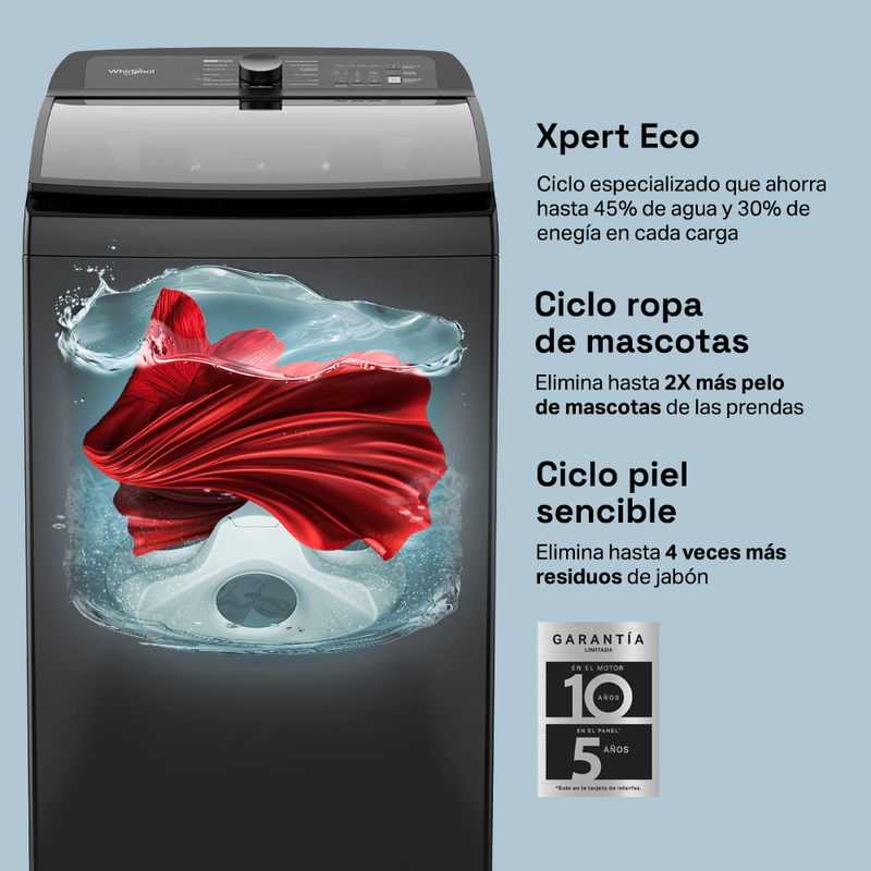 lavadora Whirlpool, tendrás un lavado inteligente que combina ahorro, tecnología avanzada y un cuidado experto para tus prendas.