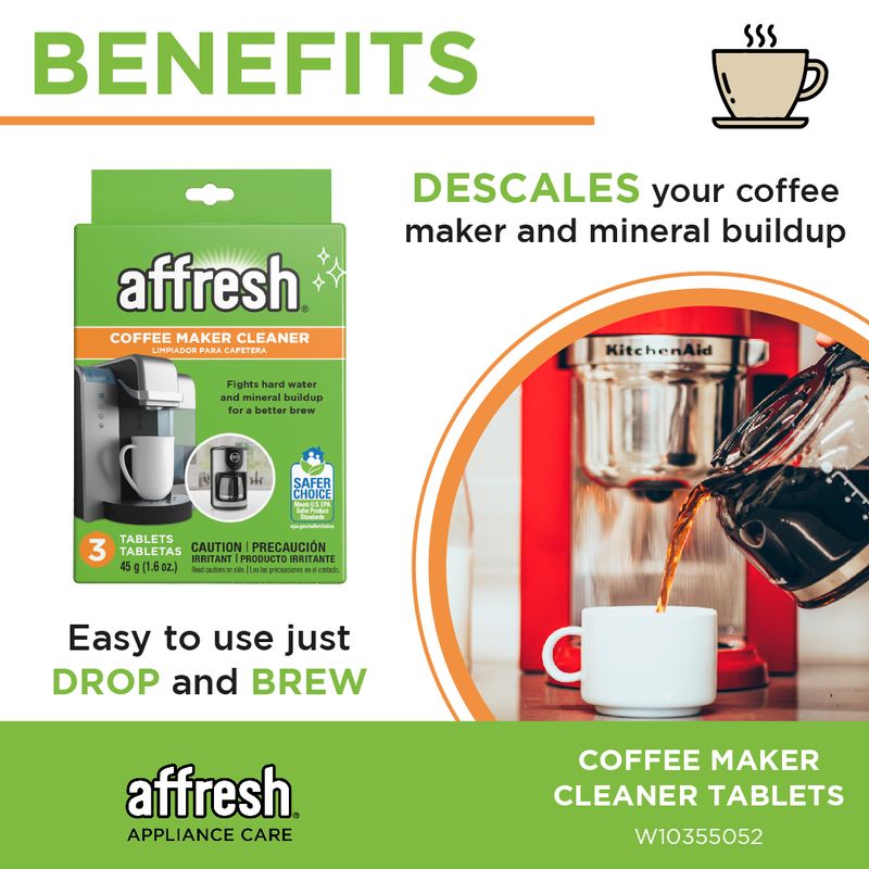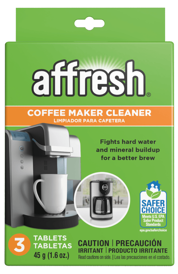 Tabletas limpiadoras de cafeteraEl limpiador para cafetera affresh® está formulado específicamente para quitar el sarro de su cafetera y evitar el acumulamiento de minerales que pueden prolongar el tiempo de preparación, lo que afecta el sabor de su café. Cada tableta es fácil de usar. No necesita mezclar, medir ni agitar. Sencillamente, déjela caer y filtre.